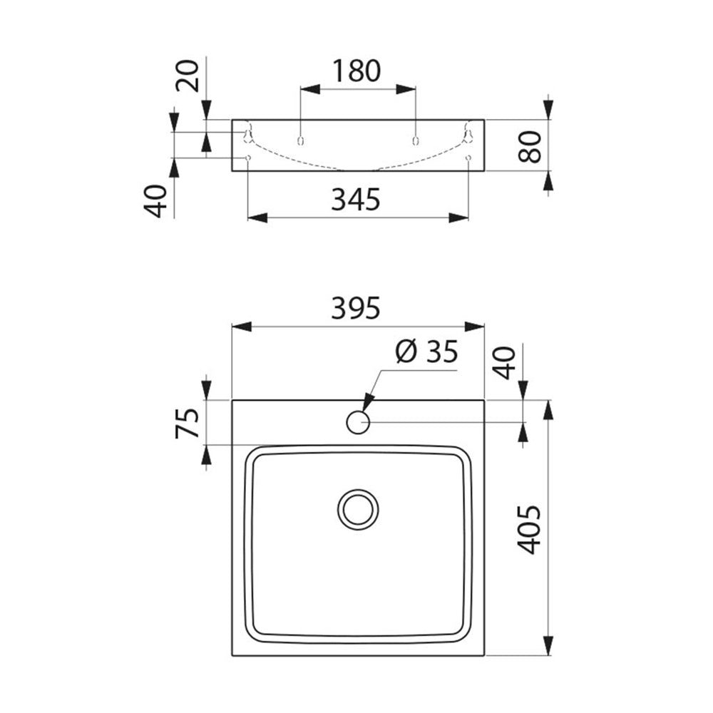 Waschtisch für Wandmontage, 395 x 405 mm.