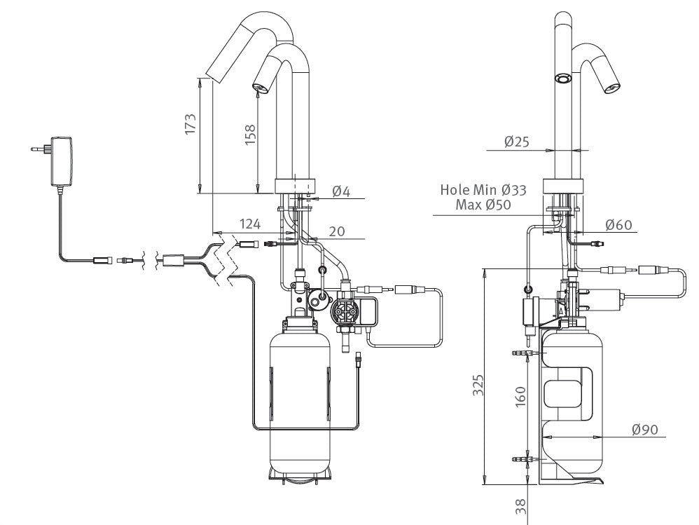 Pompe péristaltique permettant l'utilisation de tout type de savon liquide, de détergent ou de gel antibactérien.