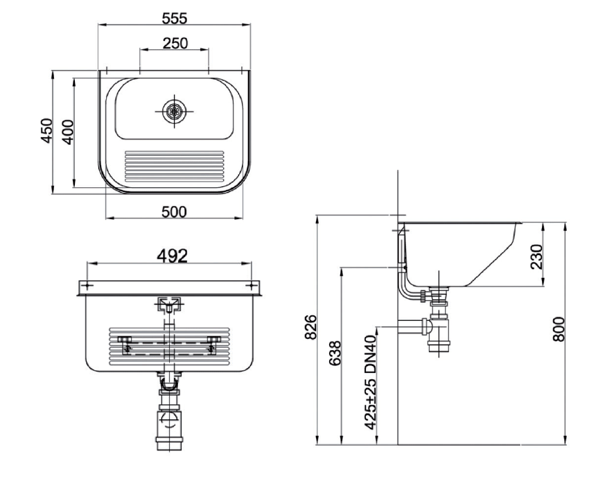 Le lavabo universel est fabriqué en acier inoxydable 1.4301, la surface est polie mate.