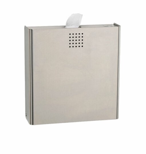 La poubelle hygiénique avec distributeur de sacs hygiéniques intégré est destinée à être fixée au mur. L'ensemble est fabriqué en acier inoxydable, la surface est polie mate. L'épaisseur du matériau est de 1,5 mm. La poubelle interne en plastique a une capacité d'environ 4 litres. La poubelle se ferme automatiquement. Le distributeur de sacs hygiéniques intégré convient aux boîtes de sacs hygiéniques d'un maximum de L 132 x L 87 x H 20 mm. Cela correspond aux boîtes disponibles dans le commerce. Vous êtes donc flexible et indépendant du fournisseur. Les vis en acier inoxydable, les chevilles et la rosette de couverture (si les sacs d'hygiène ne sont pas fournis) sont inclus dans la livraison.