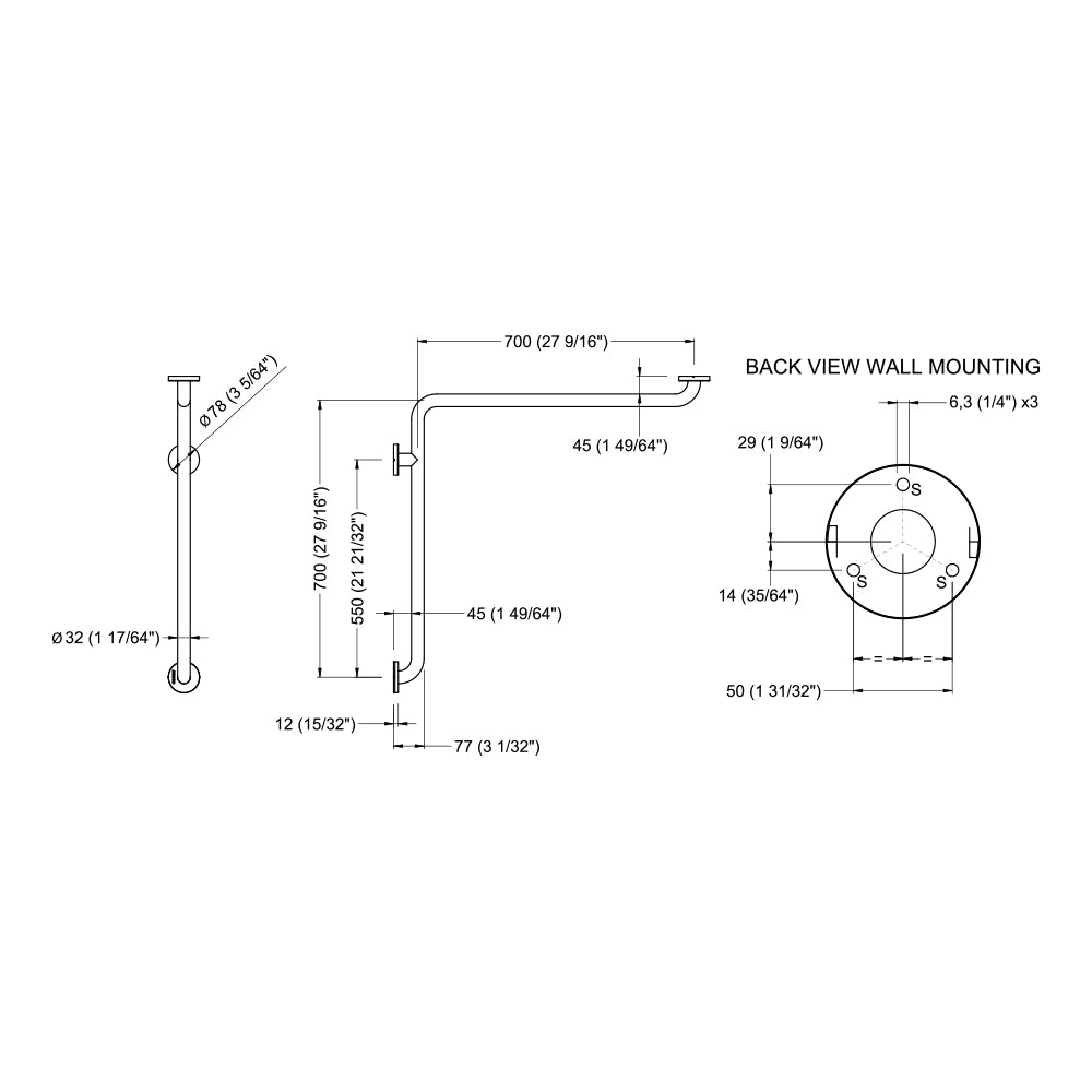 2-Wand-Haltegriff, Edelstahl matt, Ø 32, 700 x 700 mm