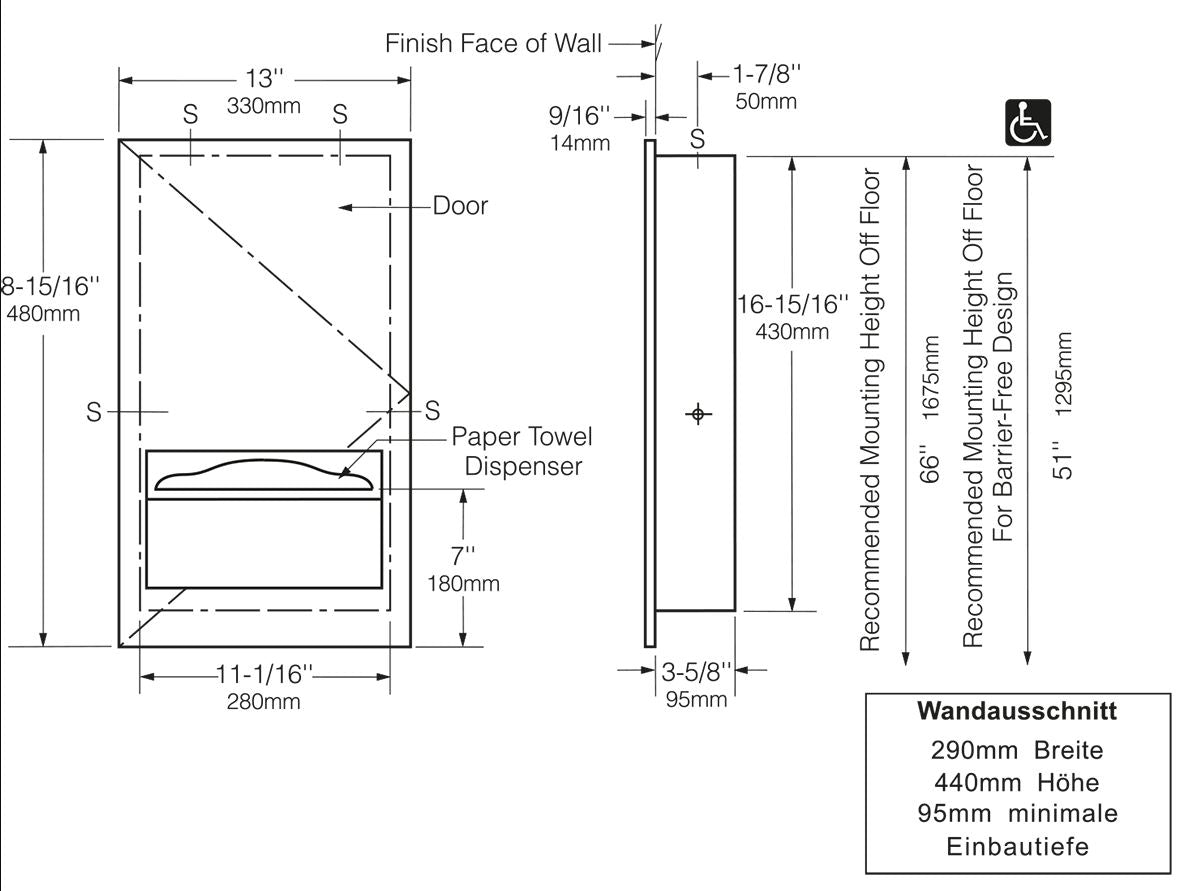Rohbauöffnung: 290 mm B, 440 mm H, 95 mm Mindesttiefe
