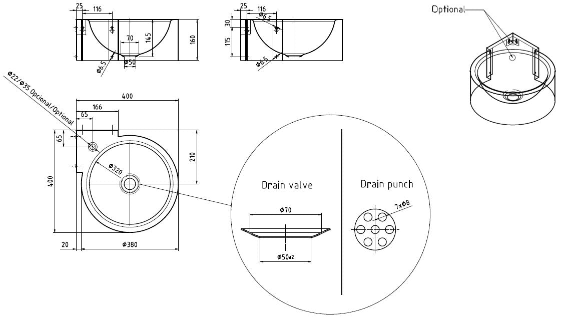 Hahnloch: Standardmäßig ohne Loch (optional Ø22 oder Ø35 mm).