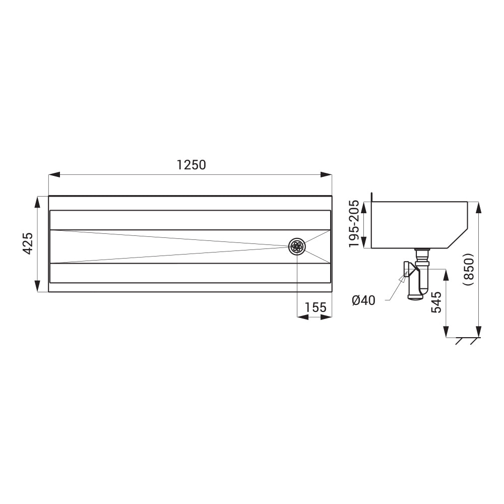 Lieferumfang: Edelstahl Waschrinne 1250 mm, Siphon, Montagesatz