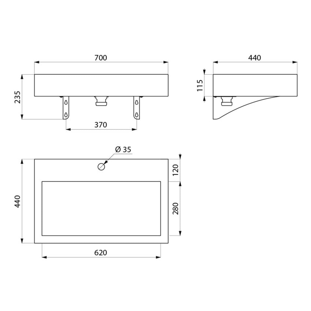 Waschtisch für Wandmontage, 700 x 440 mm.