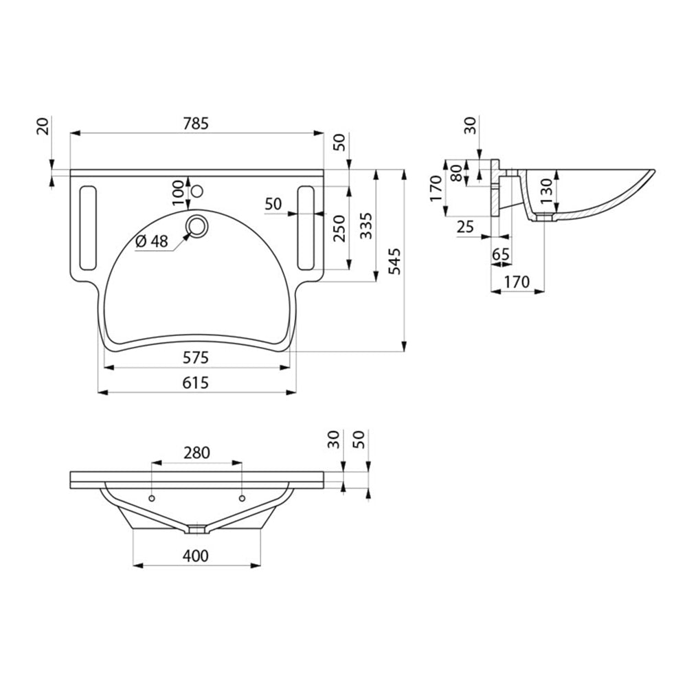 Waschtisch für Wandmontage, 785 x 545 x 170 mm.
