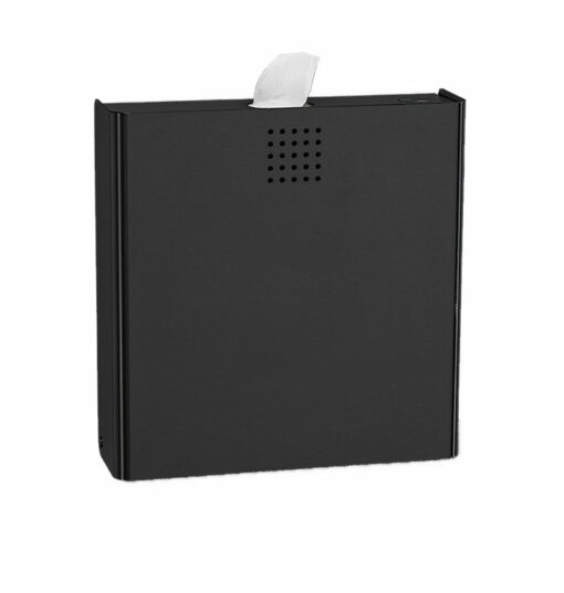 Der Hygieneabfallbehälter mit integriertem Hygienebeutel Spender ist für die Wandmontage. Gefertigt ist die Garnitur aus Glasperlen-gestrahltem Aluminium, schwarz anodisiert. Die Materialstärke beträgt 3 mm. Der innenliegende Kunststoff-Aufnahmebehälter hat ein Fassungsvermögen von ca. 4 Litern. Der Abfallbehälter schliesst automatisch. Der integrierte Hygienebeutelspender ist geeignet für Hygienebeutelschachteln bis maximal L 132 x B 87 x H 20 mm. Dies entspricht im Handel erhältlichen Boxen. Sie sind also flexibel und unabhängig vom Lieferanten. Edelstahlschrauben, Dübel und Abdeckrosette (falls Hygienebeutel nicht zur Verfügung gestellt werden) sind im Lieferumfang enthalten.